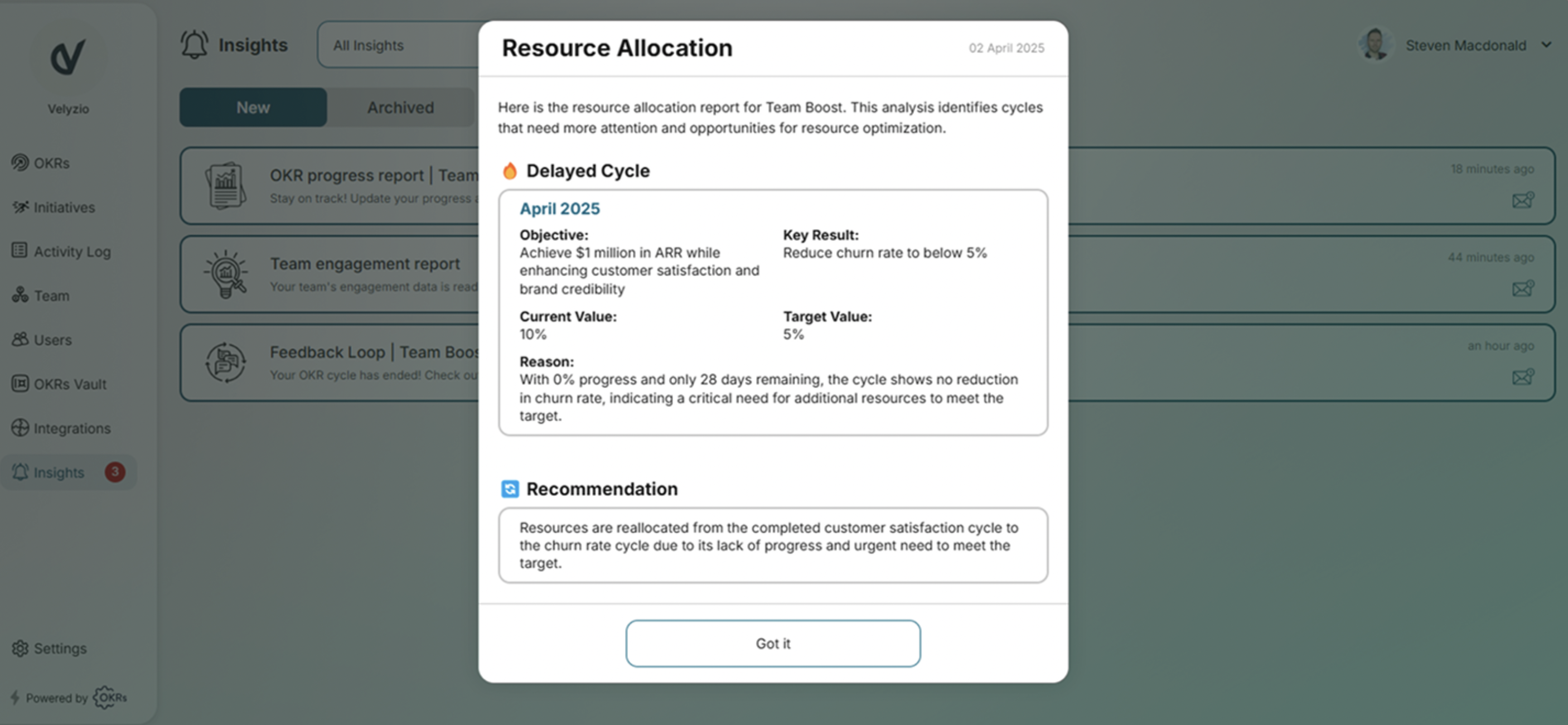 When priorities shift, so should your resources. Dynamic Resource Allocation uses real-time OKR performance data to suggest how best to reassign people, time, and budget - ensuring your team stays focused on what matters most.